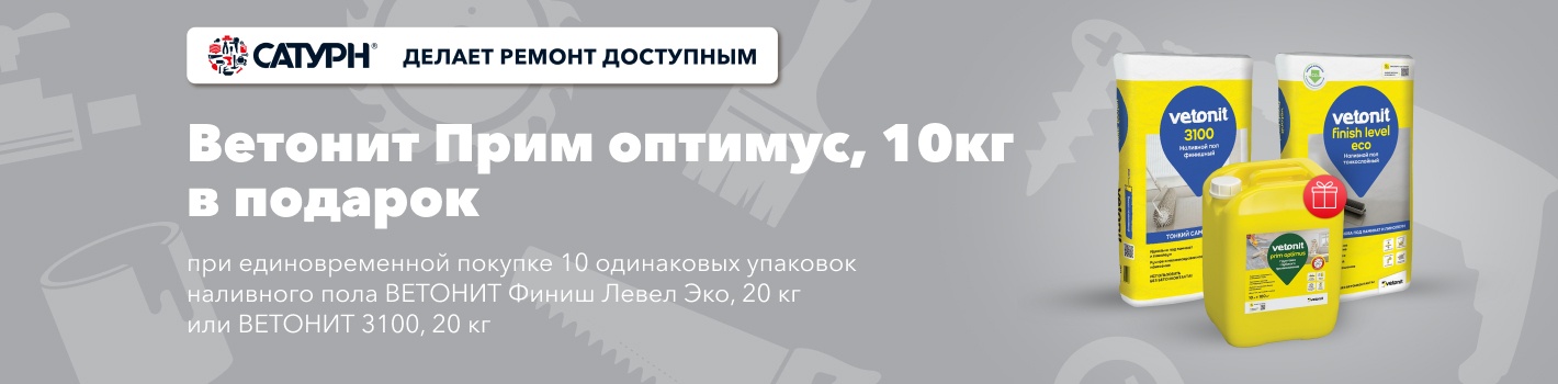 При единовременной покупке 10 одинаковых упаковок наливного пола ВЕТОНИТ Финиш Левел Эко (20 кг) или ВЕТОНИТ 3100 (20 кг), Вы получаете 1 упаковку грунтовки ВЕТОНИТ Прим Оптимус (10 кг) в подарок!