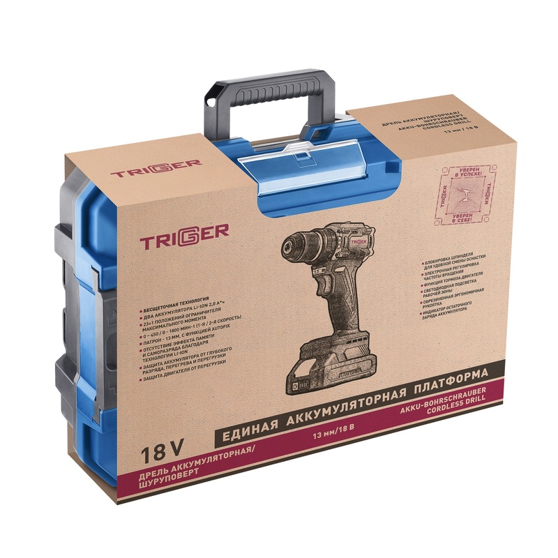 Дрель-шуруповерт Trigger 20121, бесщеточная, 2 аккумулятора Li-ion (2Ач), 18V, 13 мм, 58 Нм, кейс в Стерлитамаке
