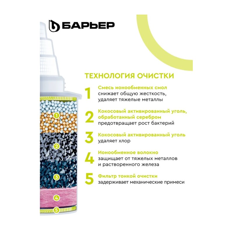 Предназначена для комплексной очистки воды от солей жесткости, тяжелых металлов, органических и неорганических примесей, хлора и хлорорганических примесей. Кассета подходит ко всем кувшинам ТМ «Барьер».