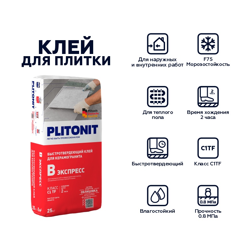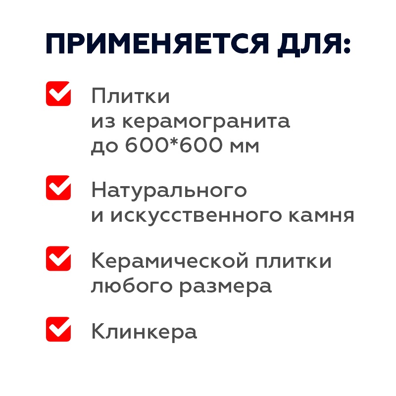 Предназначен для плитки из керамогранита, натурального и искусственного камня, клинкера, керамики. Класс С1TF. Подходит для облицовки внутри и снаружи помещения.