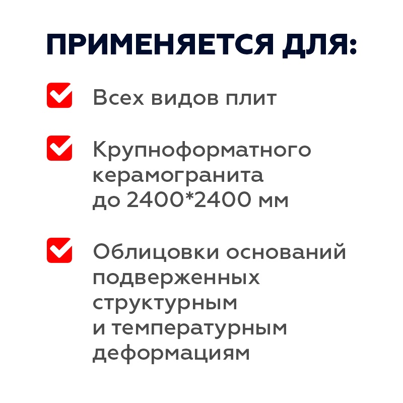 Подходит для: керамической плитки для пола и стен всех размеров; керамогранита на пол и стены до 2400х2400 мм.; использования в системе «теплый пол».