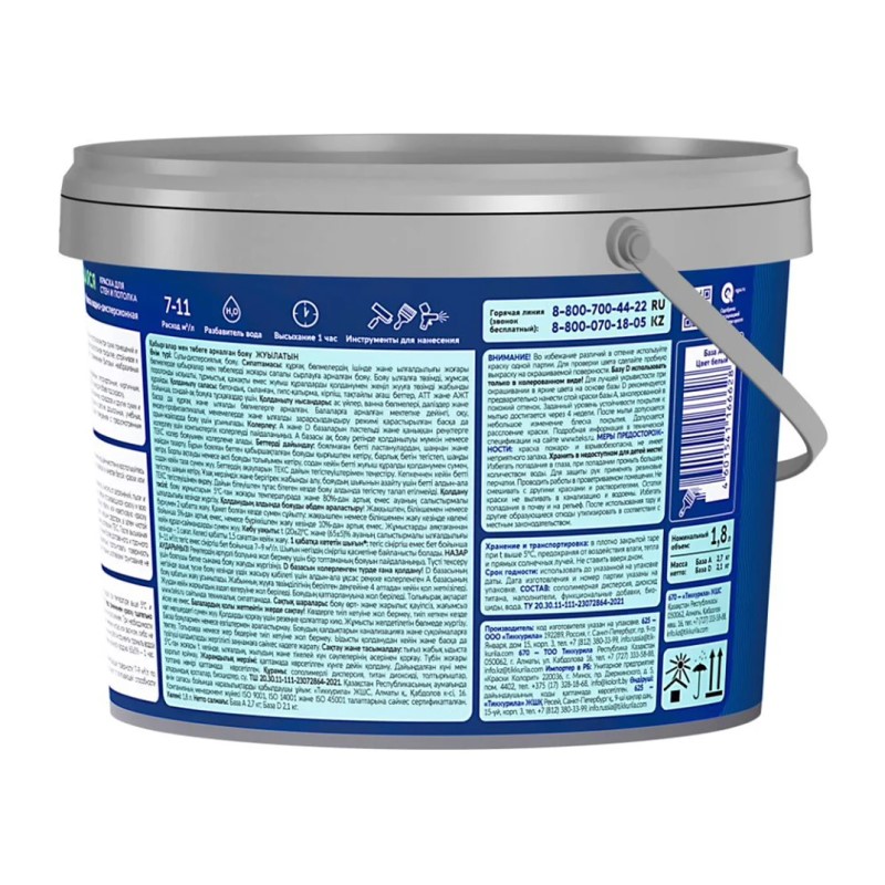 Предназначена для стен и потолков в сухих и влажных помещениях (кухни, ванные), в помещениях с повышенной проходимостью, в детских и медицинских учреждениях. Образует белое суперстойкое покрытие, устойчивое к воздействию воды. Выдерживает ежедневную влажную уборку. Сохраняет текстуру и чистоту цвета длительное время.