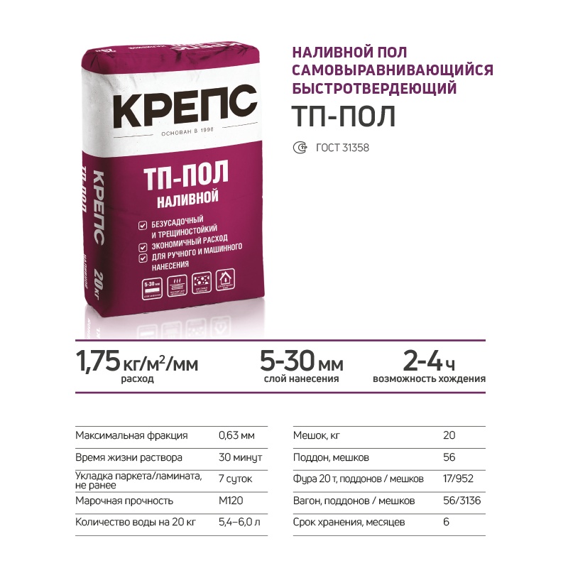 Наливной пол Крепс ТП-пол самовыравнивающийся, 20 кг