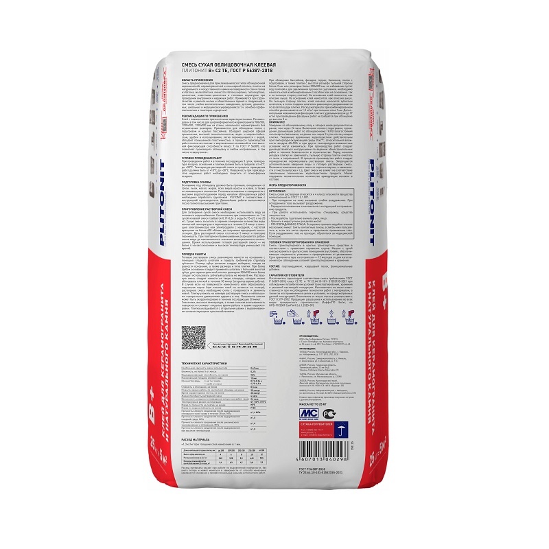 Plitonit B+ - клей для плитки из натурального и искусственного камня, керамогранита, керамики. Применяется для приклеивания всех типов облицовочной керамической, керамогранитной и клинкерной плитки, плитки из натурального и искусственного камня внутри и снаружи помещений. Отличается высокой фиксирующей способностью - в процессе производства работ плитка не сползает с вертикальных оснований, что позволяет производить облицовку в любом направлении, в том числе «сверху вниз».