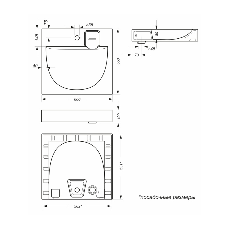 - Диаметр отверстия под смеситель: 35 мм