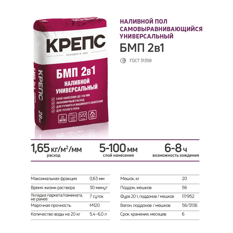 Ровнитель Крепс БМП-пол самовыравнивающийся, 20 кг