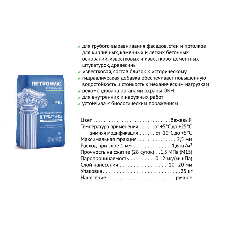 Штукатурка Петромикс известковая, с гидравлической добавкой LP-03, 25 кг