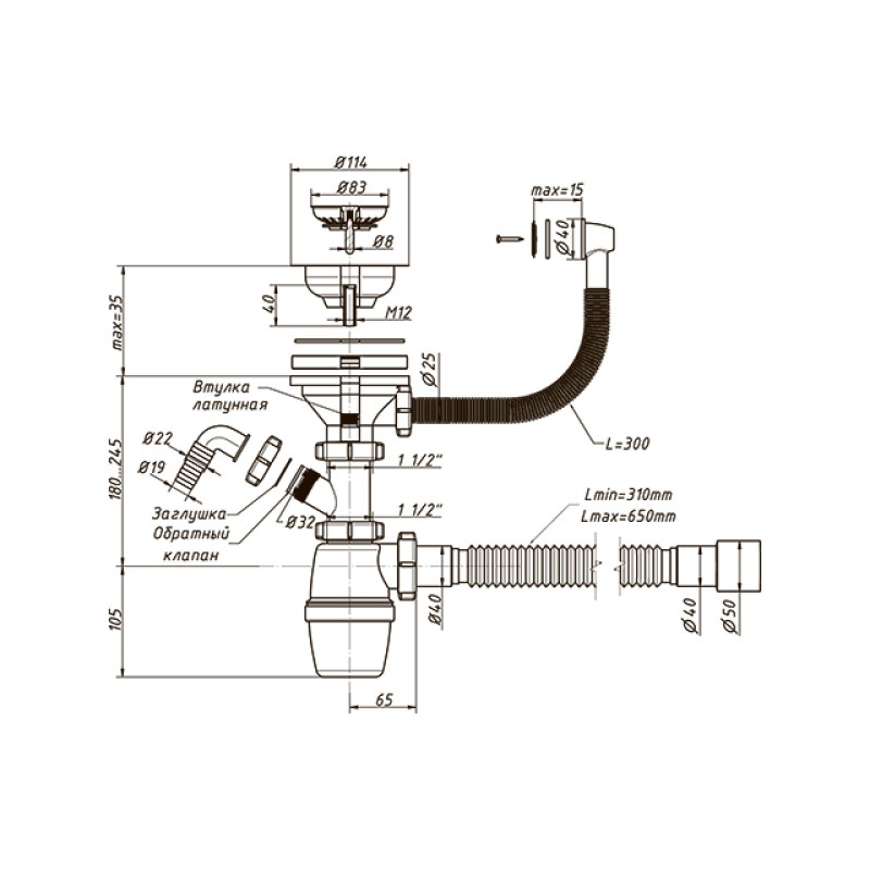 Сифон бутылочный Orio А-5011, 3 1/2"х40мм, решетка d=114мм, перелив, отвод