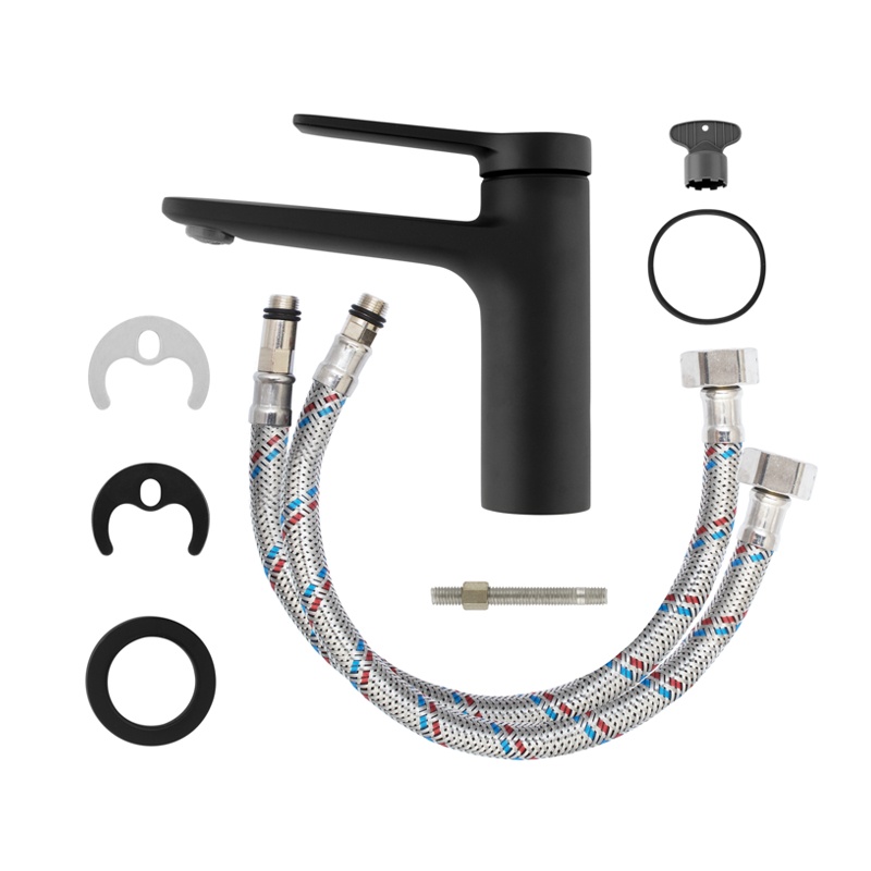 Комплектация: смеситель, гибкая подводка, комплект крепежа, ключ для снятия аэратора, паспорт изделия.