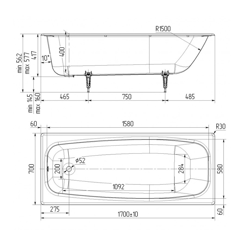 Ванна чугунная Универсал Грация, без ножек, 1700х700 мм