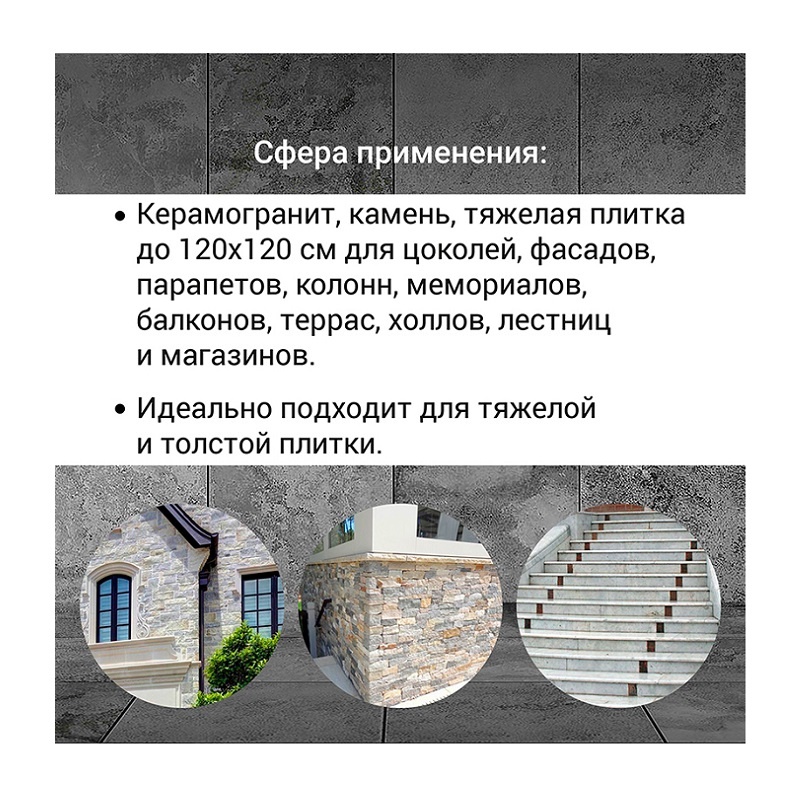 • Для плит среднего и крупного формата: Подходит для укладки плит размером до 1,2 м, что позволяет создавать современные и стильные интерьеры.