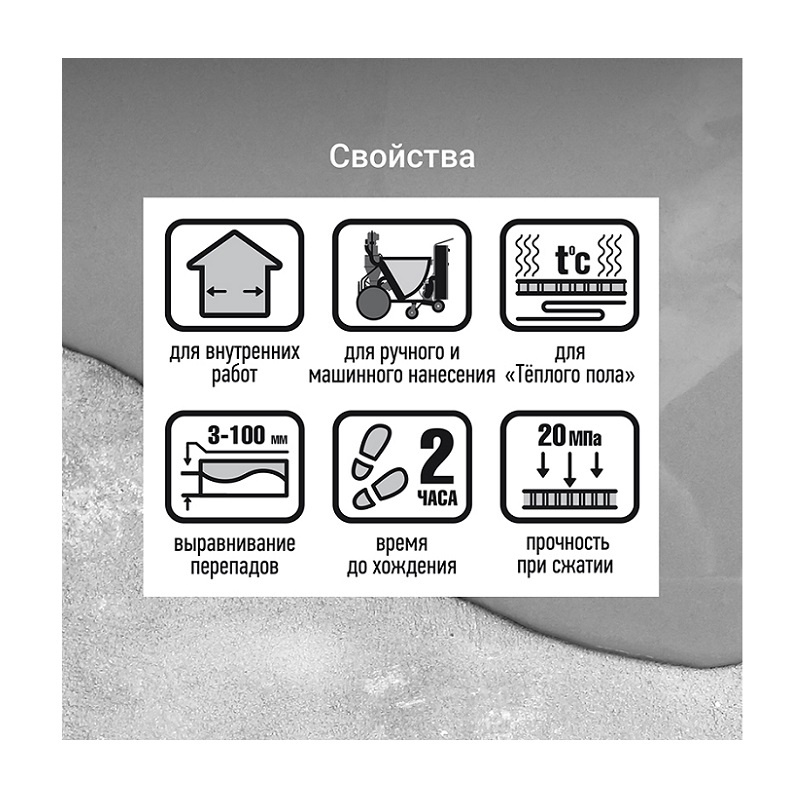 - Смесь: сухая напольная самовыравнивающаяся Рк5, В12,5 Вtb3,2 по ГОСТ 31358-2019.