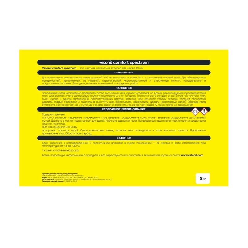 Предназначена для затирки межплиточных швов. Подходит для облицованных поверхностей, выполненных из мозаики, керамической, керамогранитной и стеклянной плитки, натурального и искусственного камня. Благодаря специальным добавкам в составе, затирка долговечна, подходит для использования внутри и снаружи зданий, в сухих и влажных помещениях и в бассейнах. Угловые и деформационные стыки (стена-стена, стена-пол) рекомендуется заполнять цветным силиконовым герметиком vetonit comfort sil цветом, подходящим под цвет затирки.